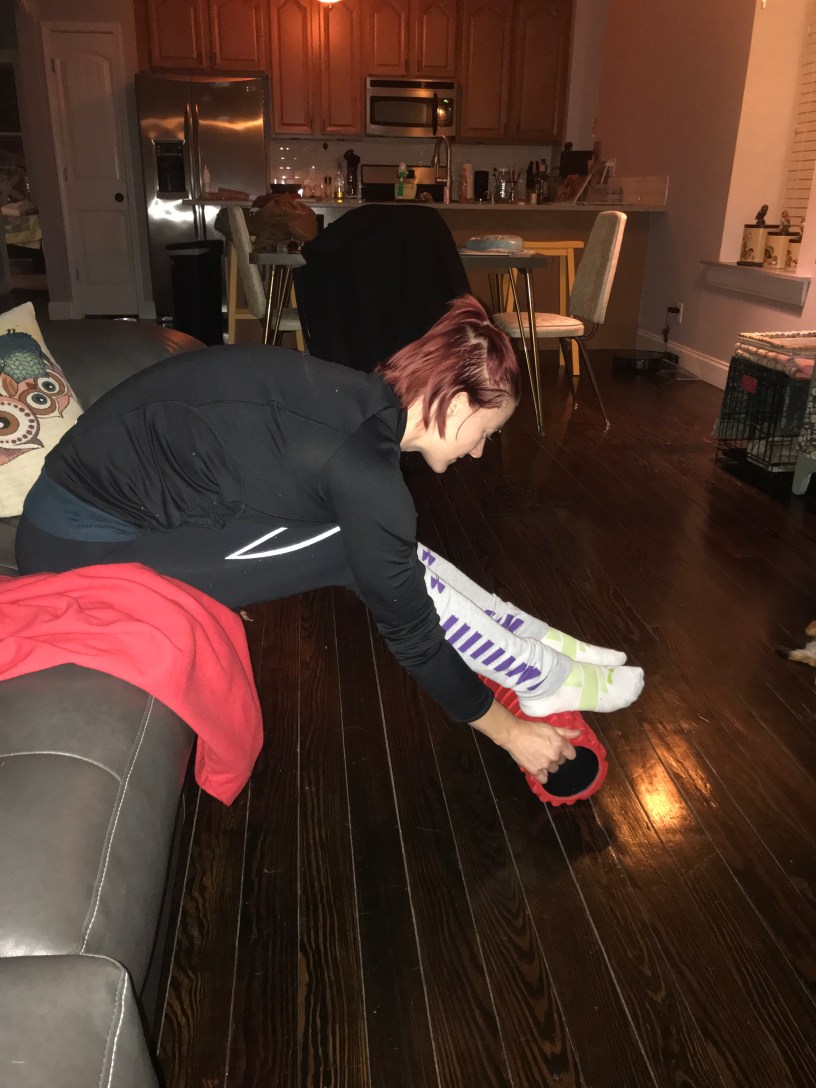 Waking up on Saturday to no alarm (just a little dog who doesn’t know how to effing sleep in) was a much needed break from the daily weekly grind. I was a bit stiff and sore but not to the point where I couldn’t move. My feet muscles were not happy and cramping was setting in (hence the picture of me rolling my feet out on a foam roller). Brandi and I decided to do a 6 mile walk around the park to get outside and move around. Yes I make my guest work out with me. I was supposed to do a 25 mile bike but considering having a guest, the weather outside and the fact that I don’t have an indoor bike trainer yet, the bike didn’t happen.