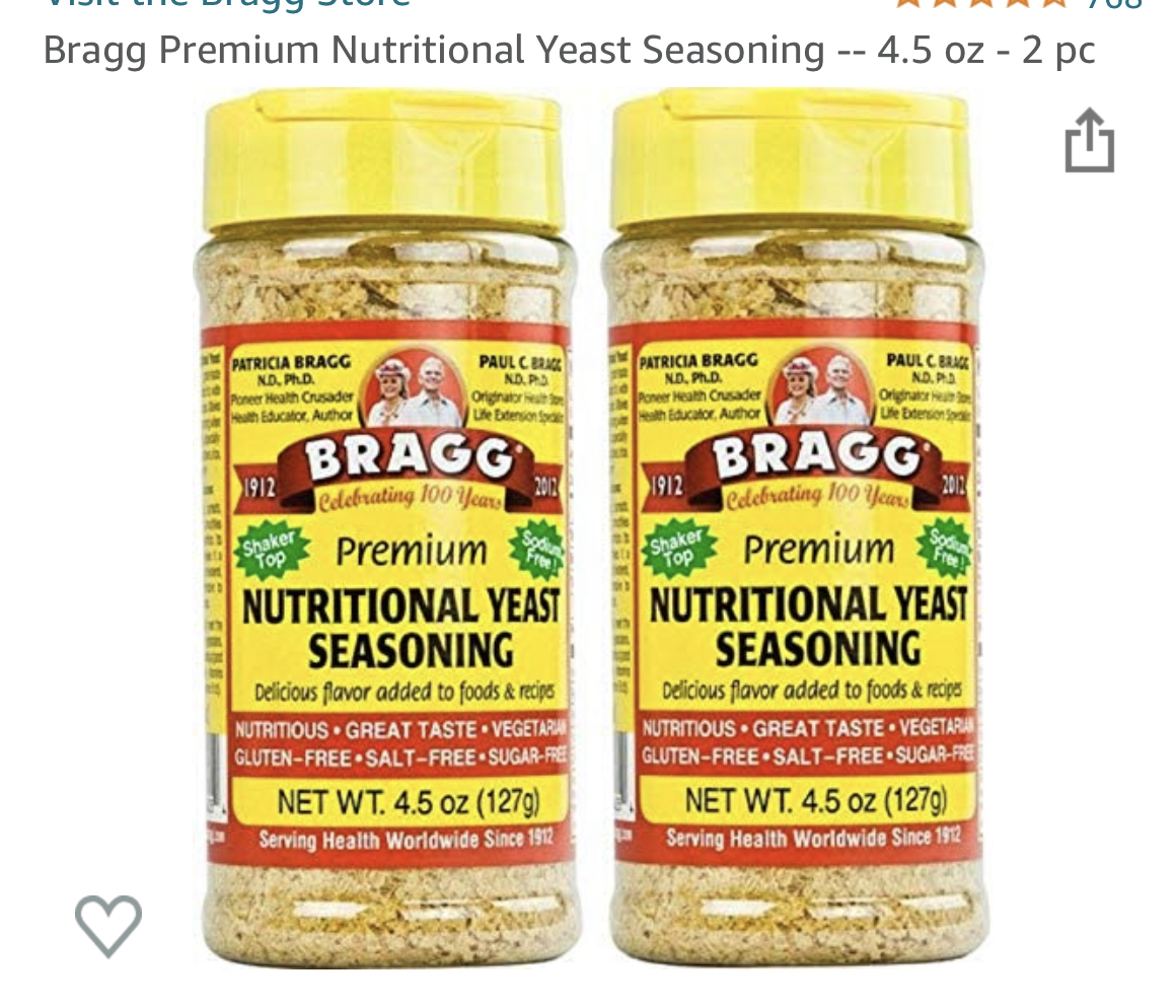 Braggs Nutritional Yeast has some protein, carbs, and a fat though the best thing about this seasoning is that it has a cheese like flavor so it makes a good addition to foods when you are on a dairy free diet.