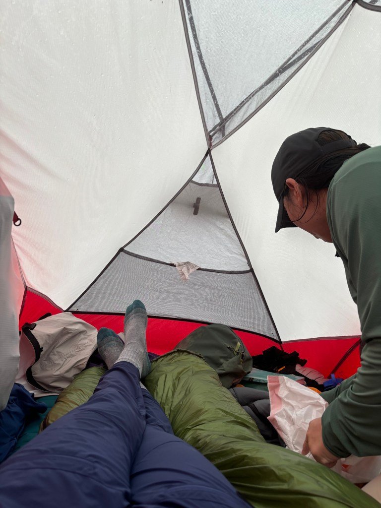 We finally made it to where we were going to camp and set up our tents in the rain. Our tent was on a slight hill so I had to rig up a way not to roll over onto Brandi when we slept. With our temporary home set up, we headed to the camp kitchen where all of the bear containers, dishes, and where we would hang out while at camp and not sleeping.