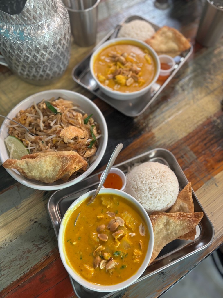 Jess and I both got the yellow curry which had chicken, coconut milk, onions, potatoes, and peanuts. It came with a side of rice and fried wontons. Carolina got the Chicken Pad Thai with fried wontons. If you are in the area and in the mood for Thai, check them out!