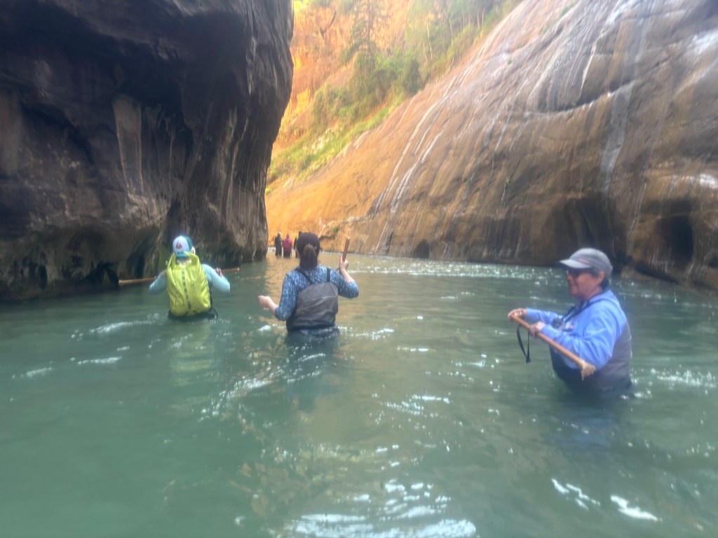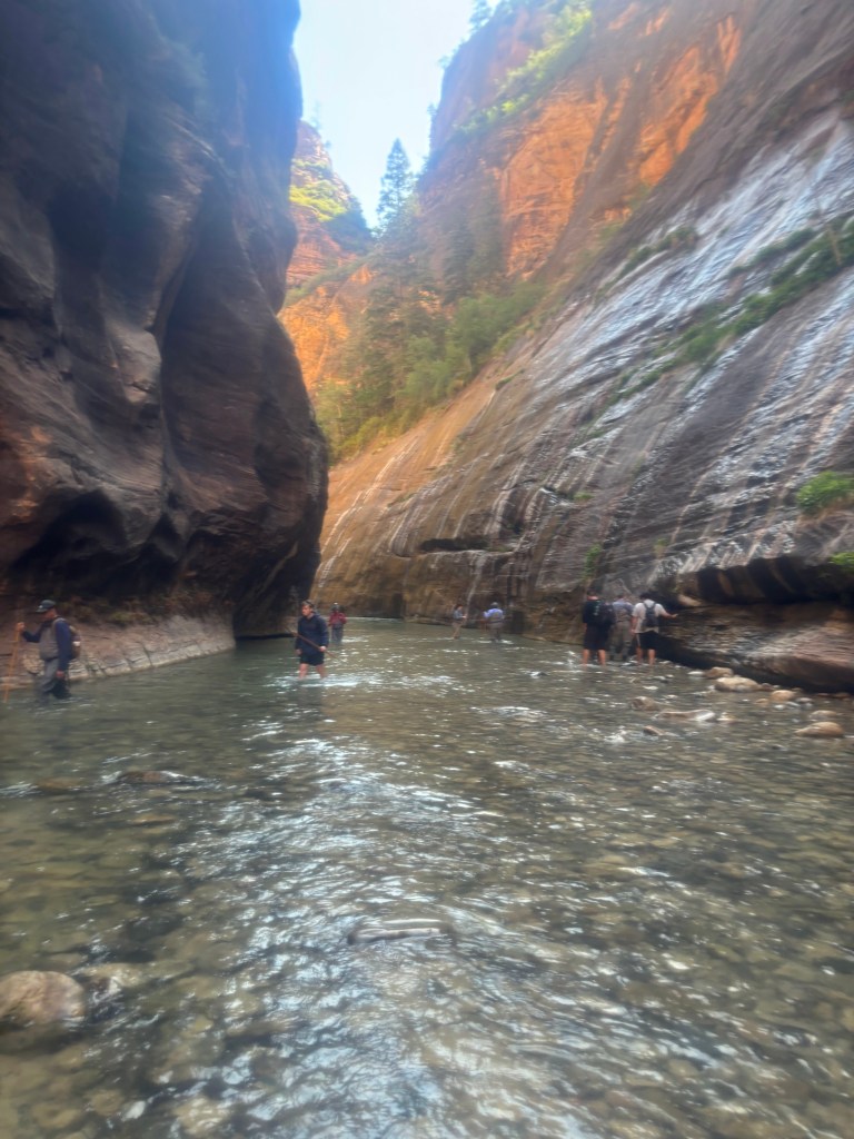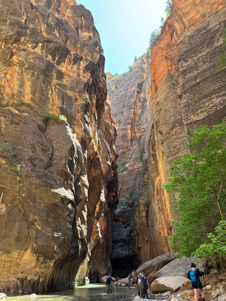 The Narrows are one of the premier hikes in Zion and one of the most famous hikes. This is also the narrowest section of Zion Canyon hence the name. Knowing this, we didn’t want to deal with a bunch of people so we went early. Considering yesterday was a high of mid/high 60’s, we decided to rent the waders, neoprene socks, shoes and walking sticks. We didn’t want to wait in line so we rented the night before so we could hit the ground running.
