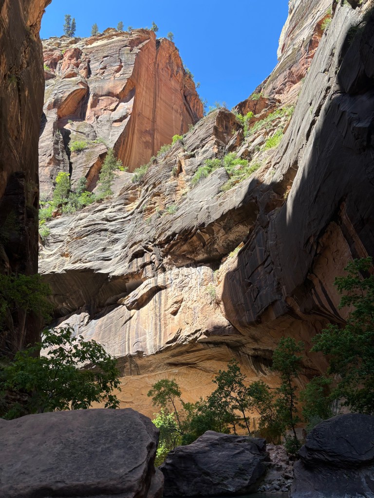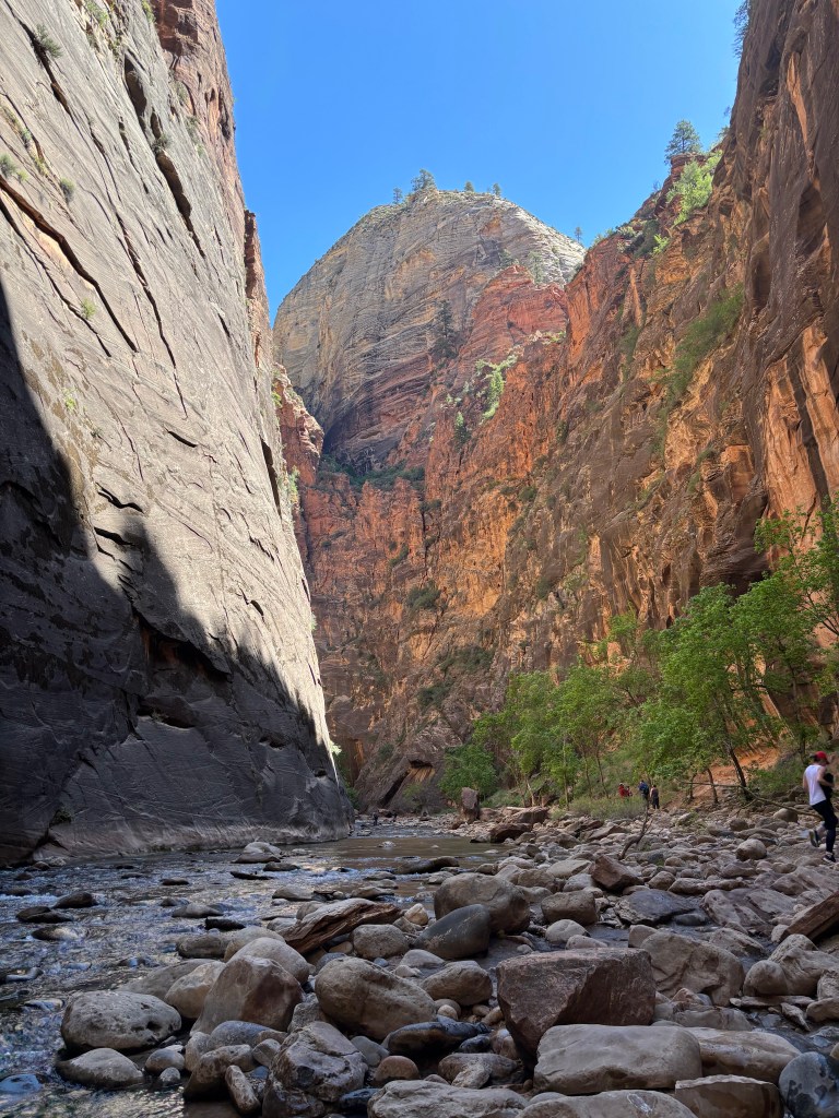 The shuttle ride to stop 9 was about 45 minutes from the Visitor Center (stop 1). It was pretty crowded with a bunch of people doing the Narrows and Angel’s landing (stop 6). At our stop, we made the mile hike down to the water (this was part of the trail) to start that part of the hike.